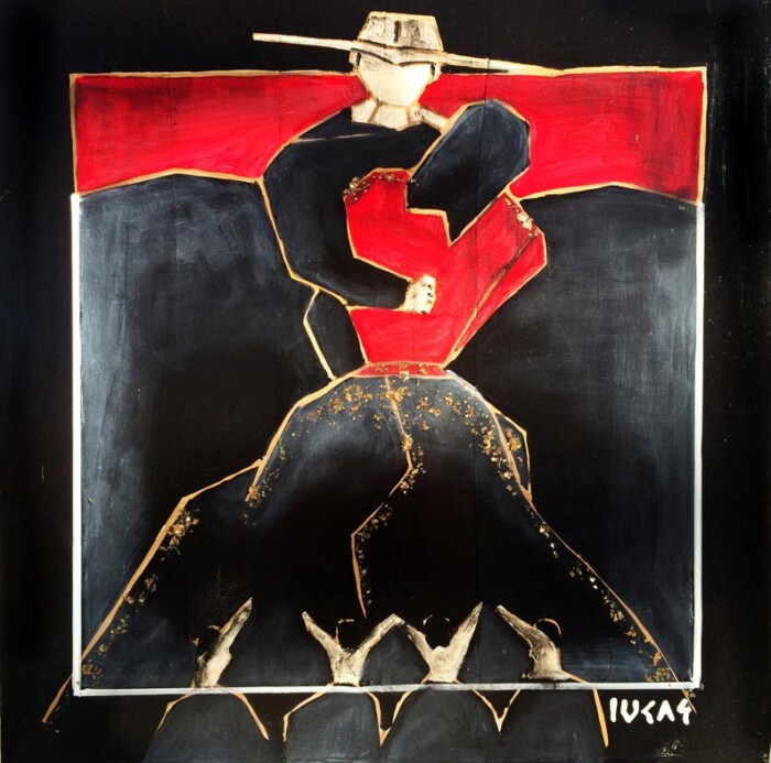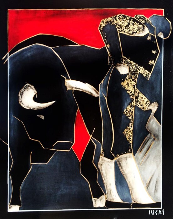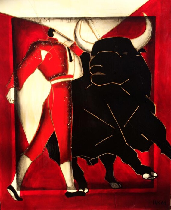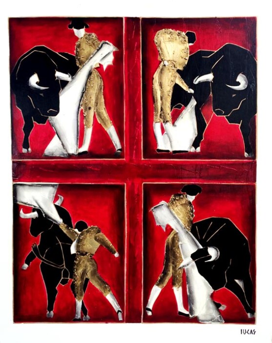 Lucas a exécuté une série de trente tableaux de grands formats. Dans chaque toile, il a réservé un espace géométrique vierge que peindront les toreros. Cette forme géométrique rouge est œuvre d’art à part entière puisqu’un être hors du commun y inscrit en langage secret sa vie passée, présente et à venir.