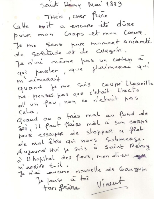 Cette nuit a encore été dure pour mon corps et mon cœur. Je me sens par moment anéanti de solitude et de chagrin. Je n’ai même pas un chien à qui parler, que j’aimerais qui m’aimerait. Quand je me suis coupé l’oreille ce n’était pas l’acte d’un fou, non ce n’était pas cela. Quand on a très mal au fond de soi, il faut faire mal à son corps pour essayer de stopper ce flot qui nous submerge. Aujourd’hui je suis à Saint Rémy à l’hôpital des fous, mon dieu que m’arrive t-il. Je n’ai aucune nouvelle de Gauguin.